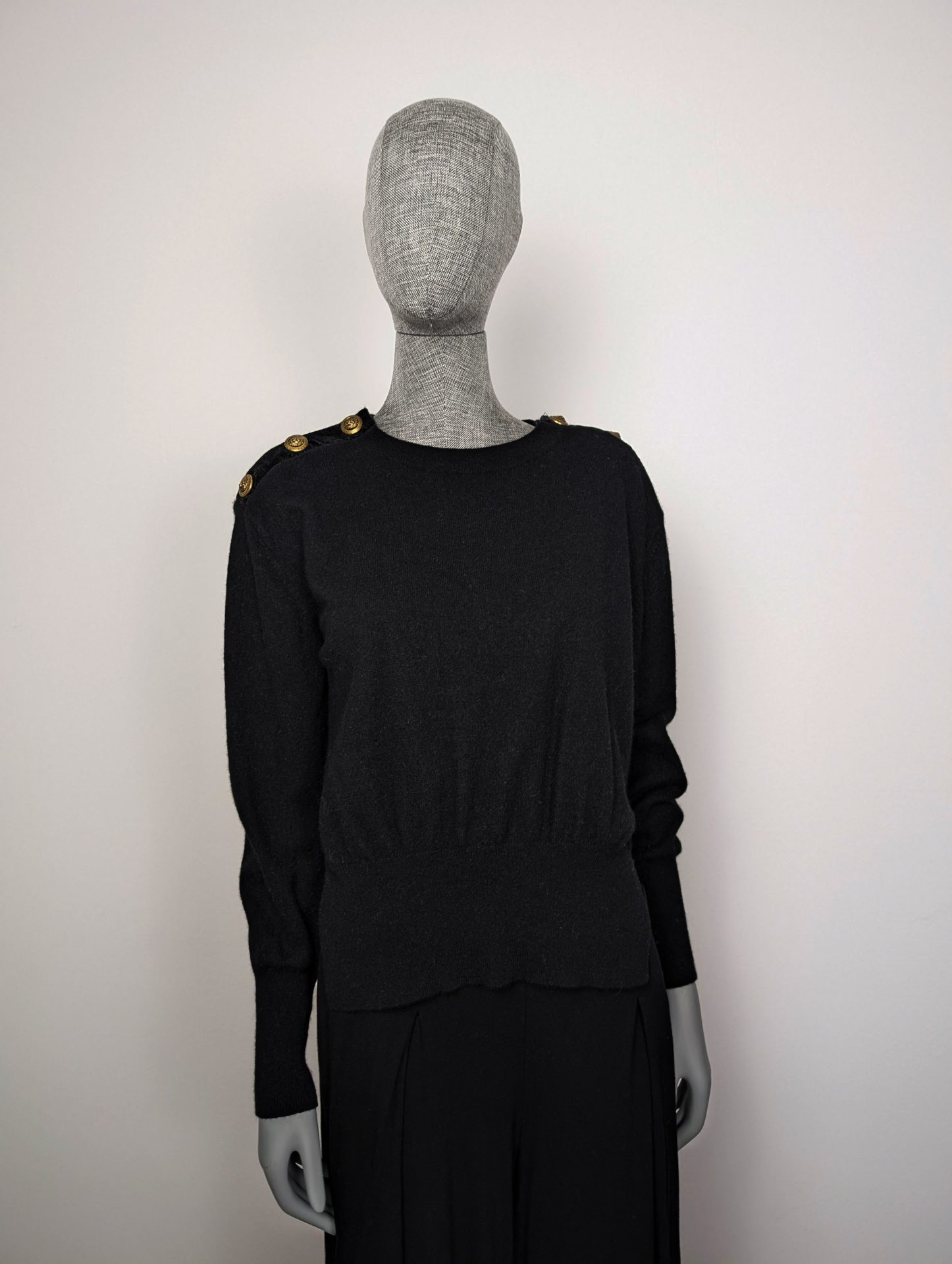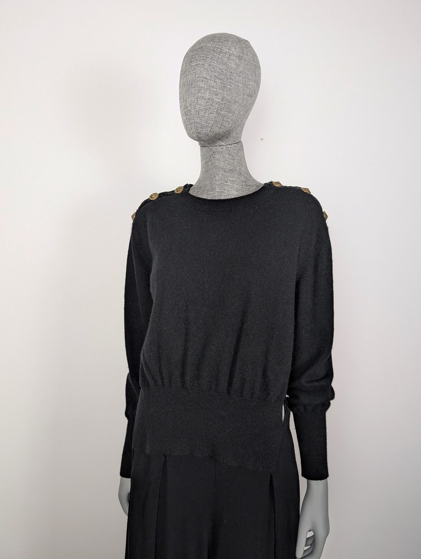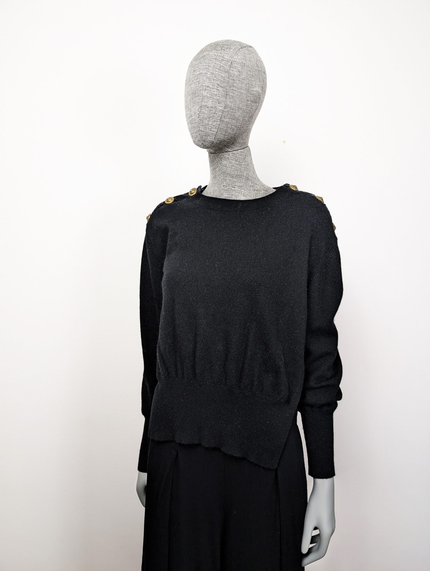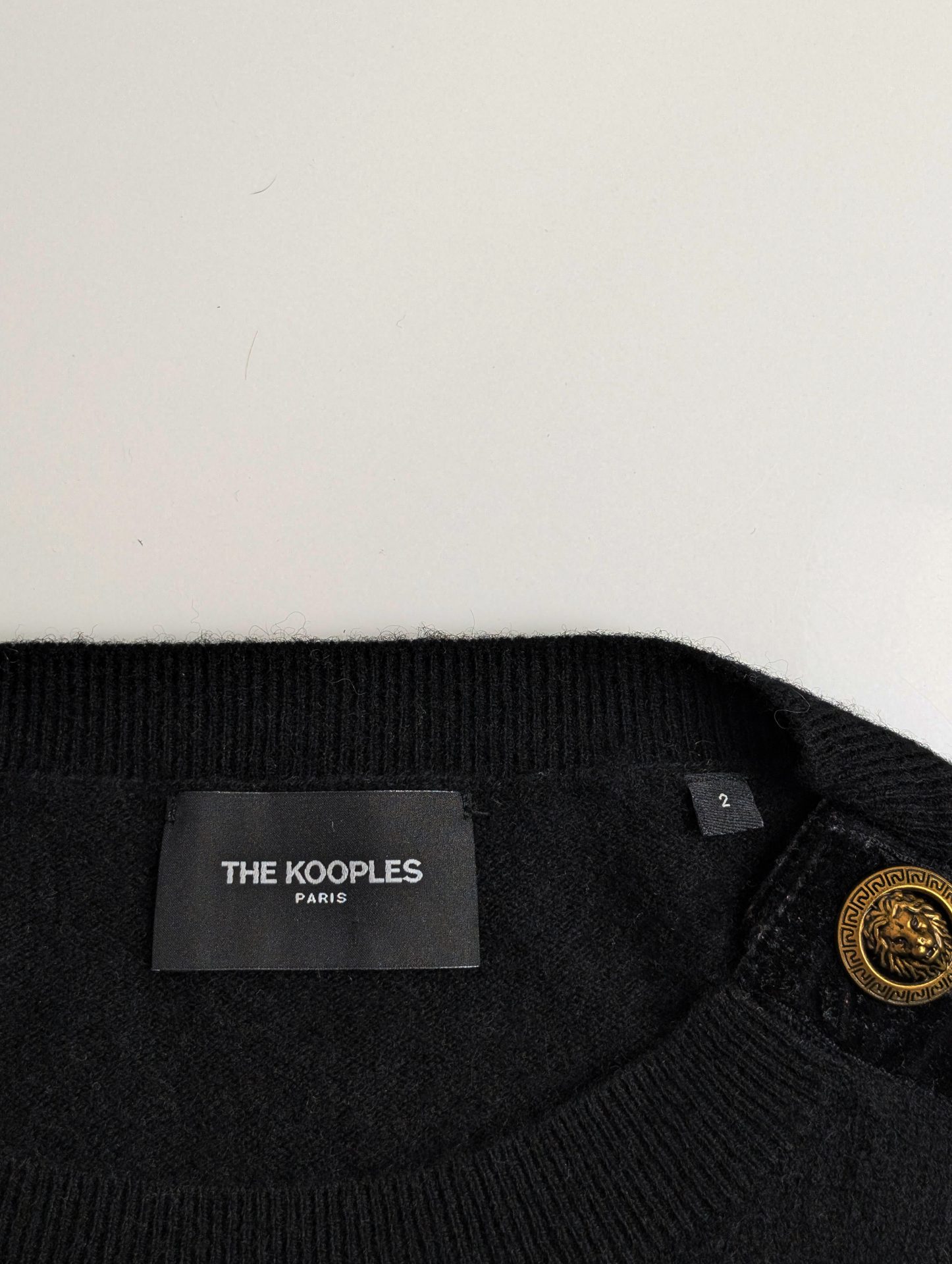 Pulover blagovne znamke The Kooples Paris. Črne barve, narejen iz 90% volne in 10% kašmirja. Večji, masivni zlati gumbi na ramenskem predelu. Velikosti 2, ustreza naši velikosti 38. Zelo dobro ohranjeno. Maloprodajna cena znaša 220 evrov.