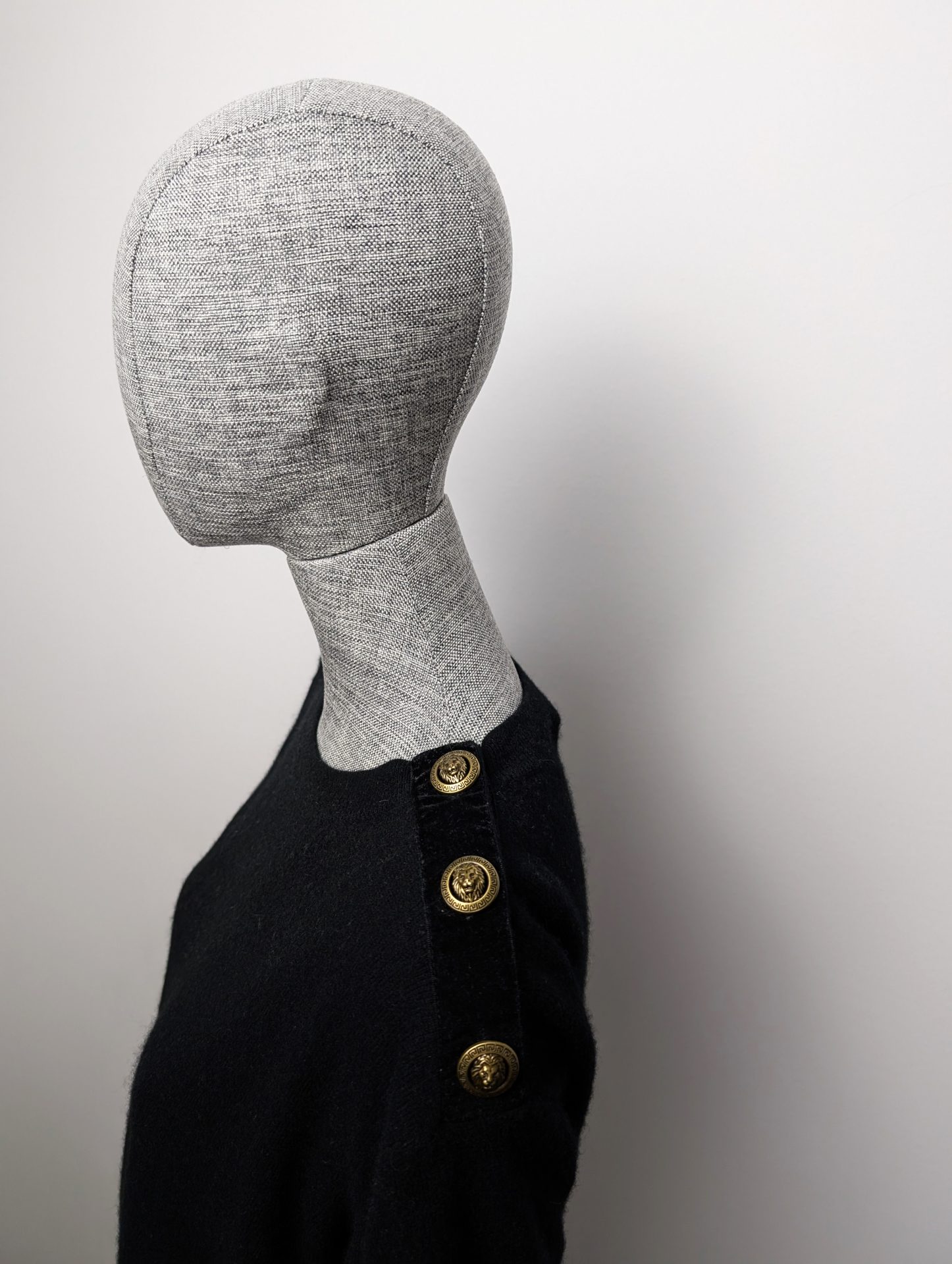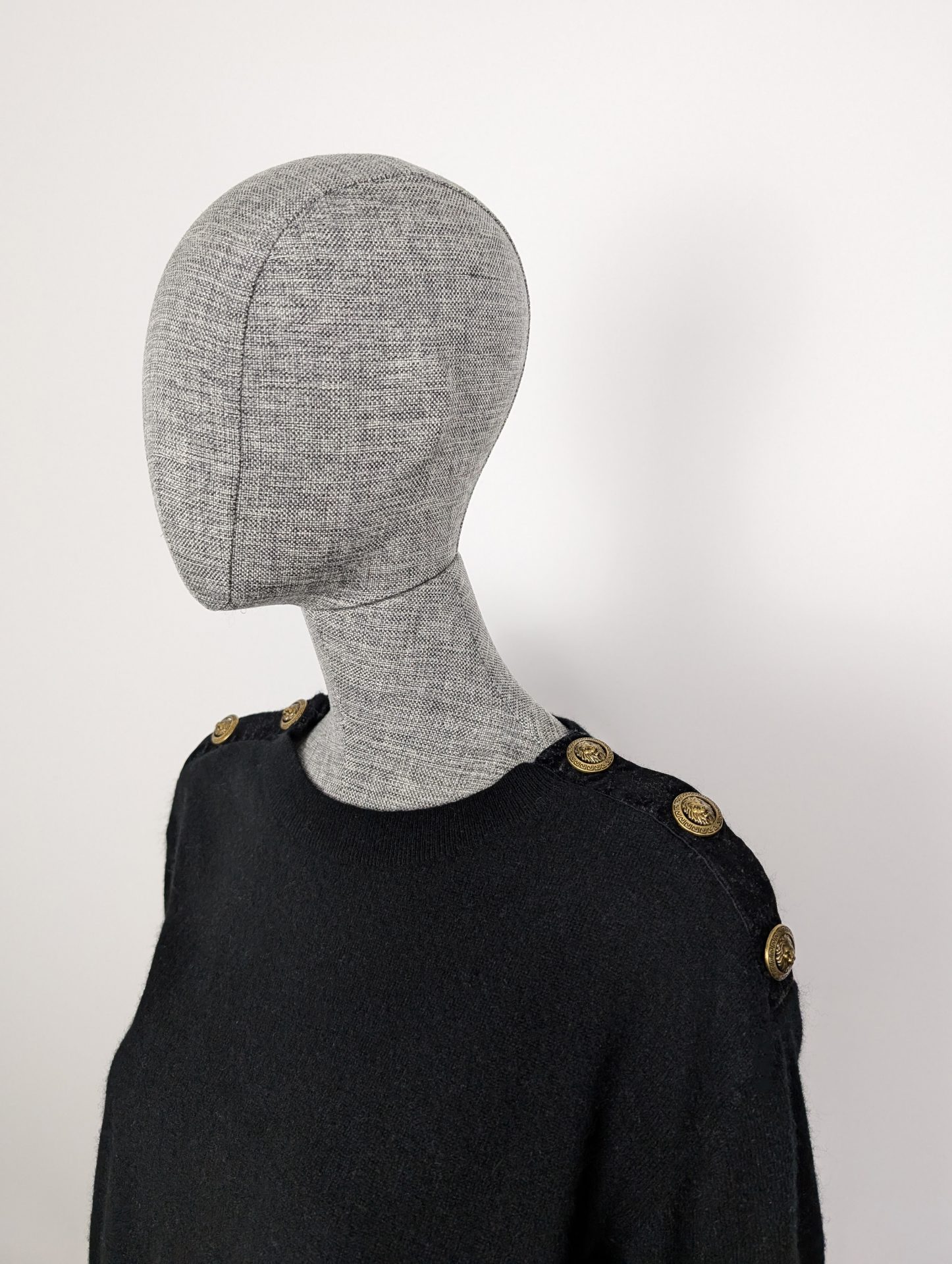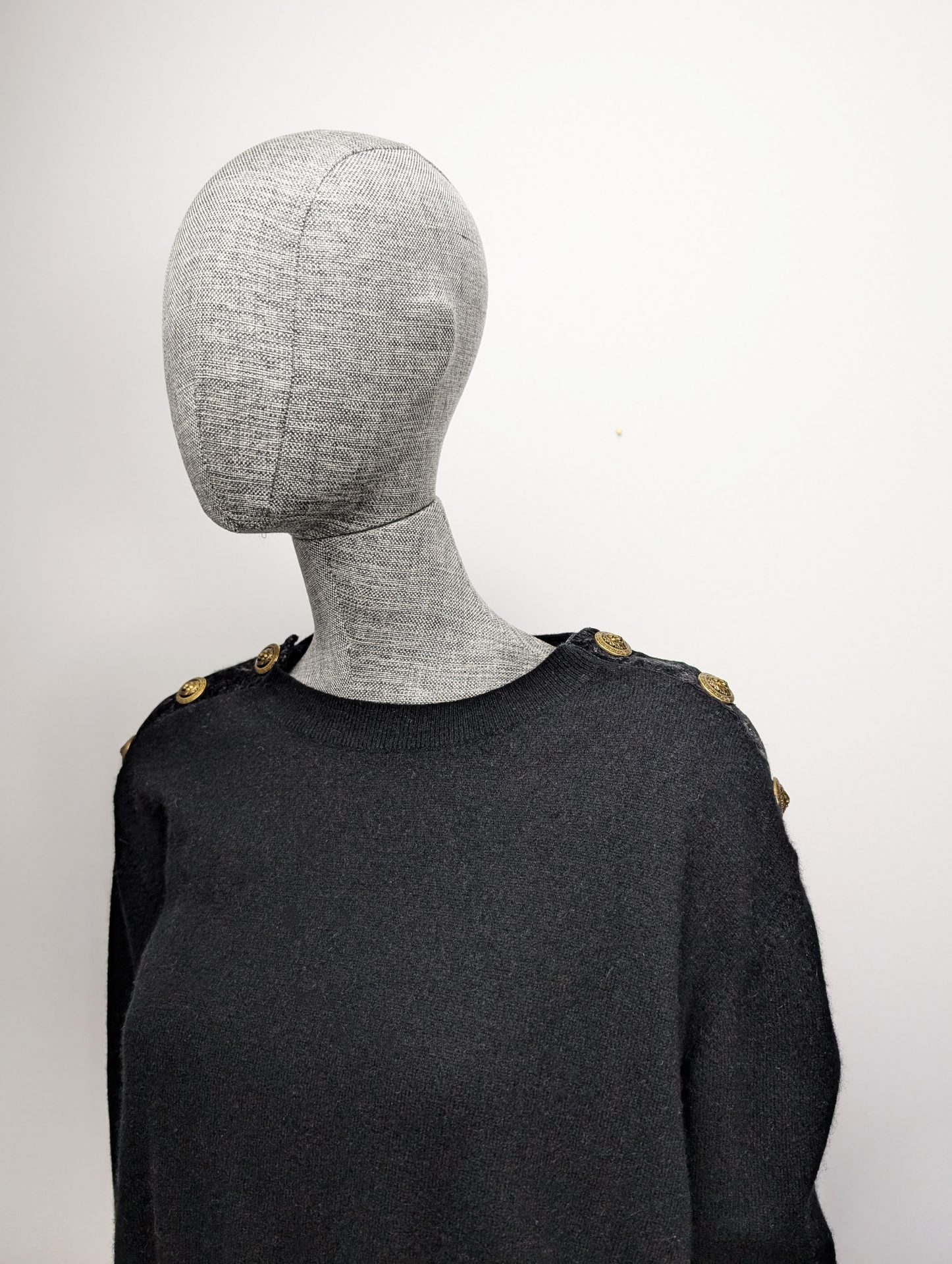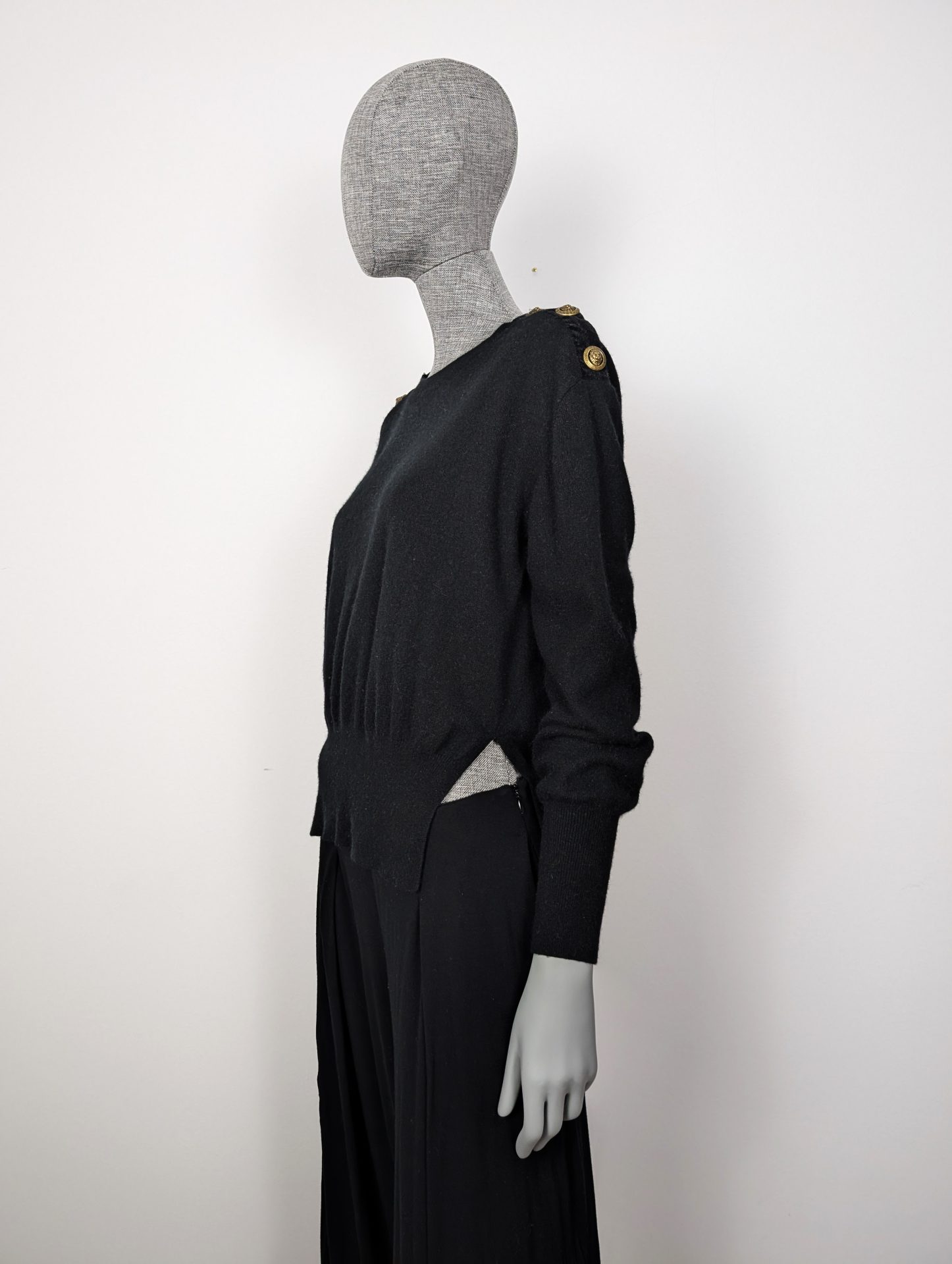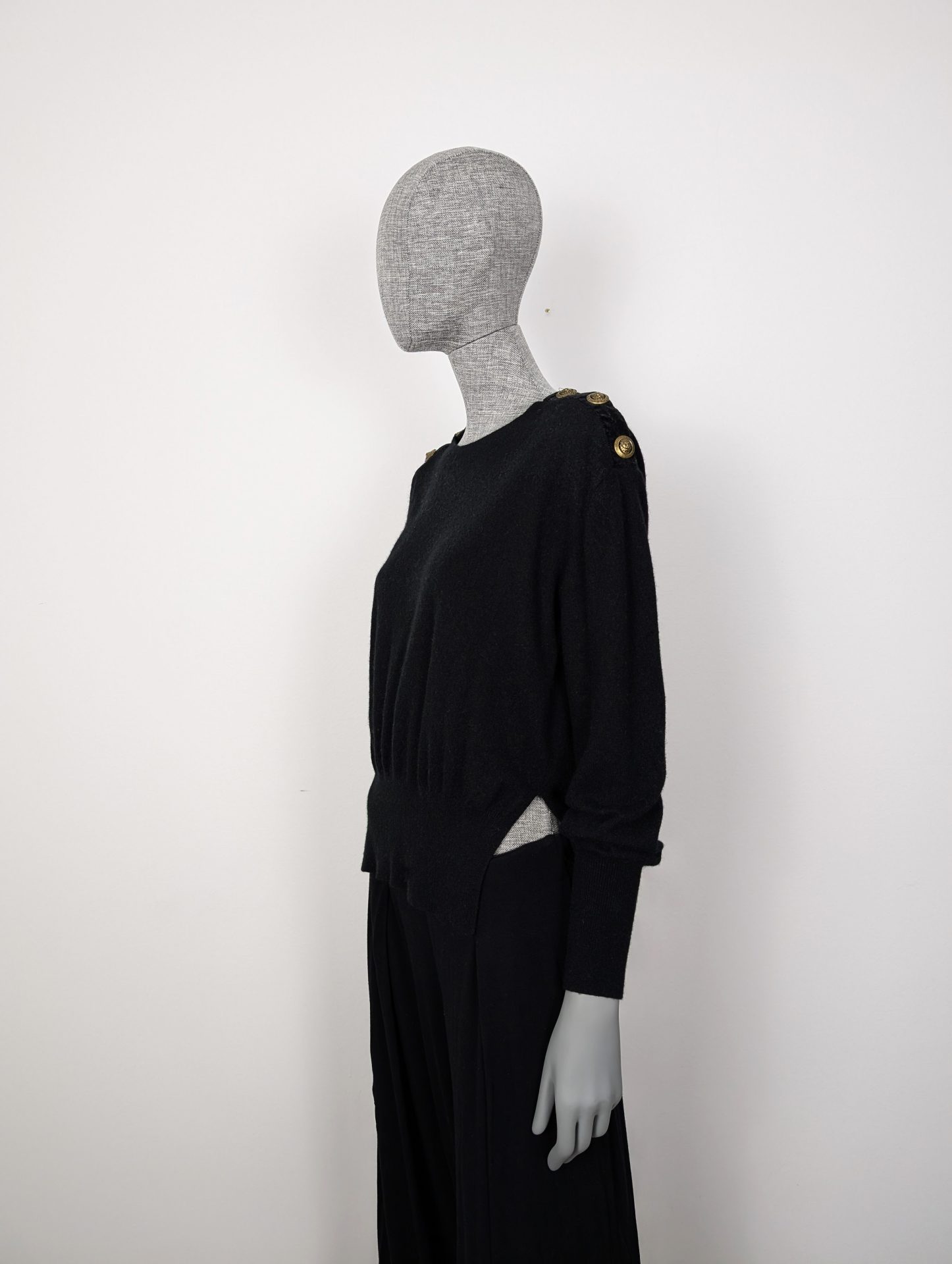 Pulover blagovne znamke The Kooples Paris. Črne barve, narejen iz 90% volne in 10% kašmirja. Večji, masivni zlati gumbi na ramenskem predelu. Velikosti 2, ustreza naši velikosti 38. Zelo dobro ohranjeno. Maloprodajna cena znaša 220 evrov.
